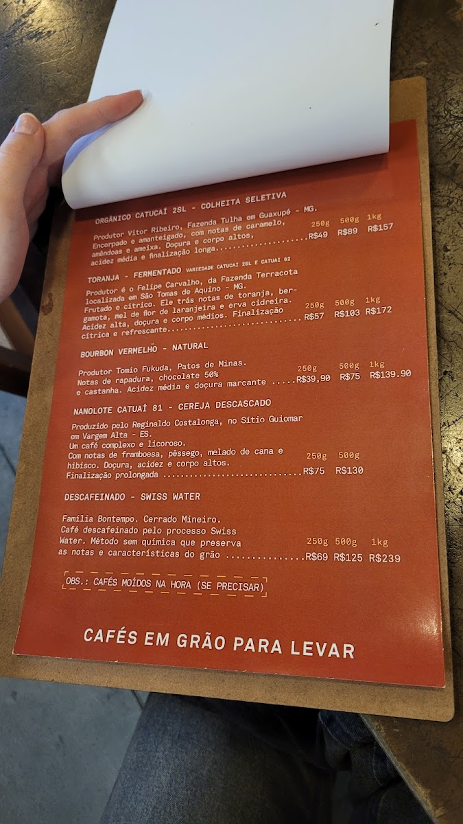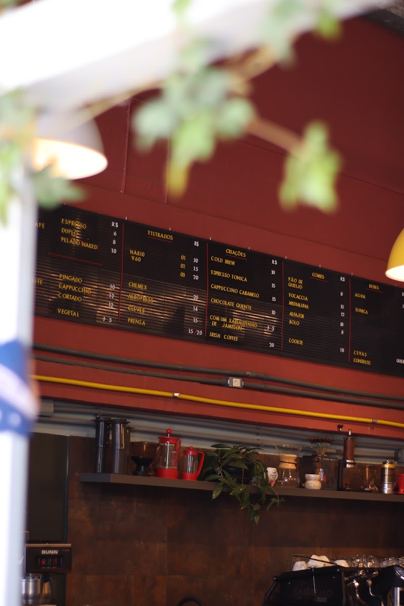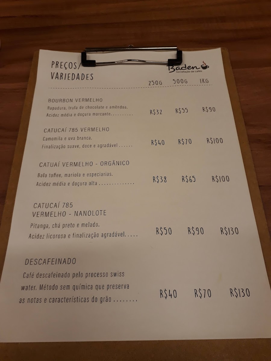 The menu at Baden Torrefacao de Cafes features a variety of specialty coffee beverages alongside a selection of light food options. The coffee offerings include espresso-based drinks such as latte, cappuccino, ristretto, and café cortado, as well as filtered coffee prepared using the V60 method and specialty items like espresso with tonic. This range caters to different coffee preferences, from simple espresso shots to more elaborate coffee preparations.